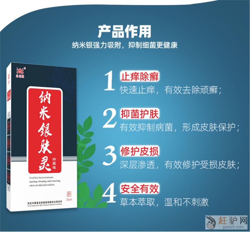 纳米银肤灵 让您告别顽固癣症 天然本草 精心配制 专攻顽癣牛皮癣 止痒除癣、抑菌护肤、修护皮损、安全有效 、草本萃取、温和不刺激 适用牛皮癣、体癣、头癣、神经性皮炎、顽固性皮肤病 一喷顽癣去无踪,皮肤重获新生.赶驴网www.ganlv5.com